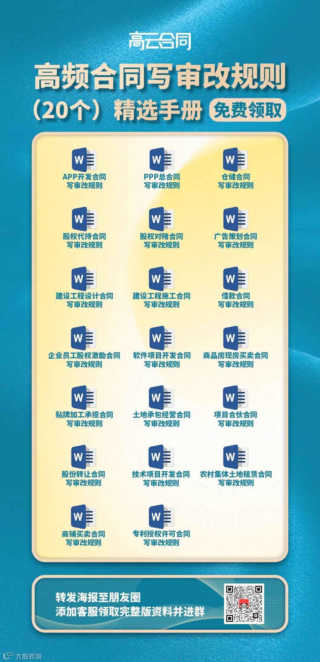 在合同实务中,合同写审改规则能帮助我们更好的开展合同业务。为了帮助大家更加专业、高效地开展这项工作,高云合同公众号限时免费赠送“20个常见合同写审改规则”资料!