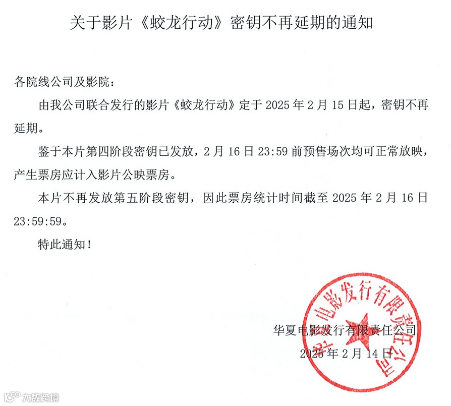 此外,参与联合发行的华夏电影宣布《蛟龙行动》定于2025年2月15日起,密钥不再延期。2月16日23:59前预售场次均可正常放映,产生票房应计入影片公映票房。票房统计时间截至2025年2月16日23:59:59。