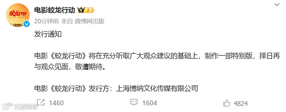 “电影《蛟龙行动》将在充分听取广大观众建议的基础上,制作一部特别版,择日再与观众见面,敬请期待。 ”