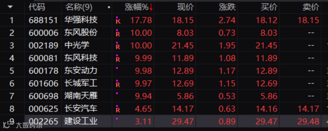 今日早盘,东风股份、东风科技、湖南天雁、中光学、东安动力、长城军工开盘涨停,华强科技、长安汽车也大幅高开,建设工业小幅高开。随后,上述公司股价走势有所分化,截至上午10点,华强科技涨幅超过17%,东风股份、东风科技、湖南天雁、东安动力、长城军工、中光学涨停,长安汽车涨超4%,建设工业涨超3%。