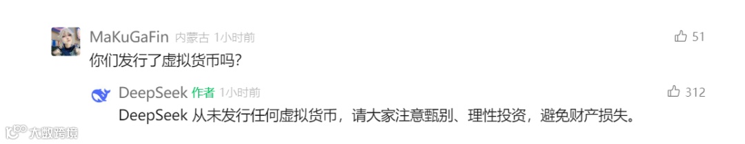 此外,对于是否发行了虚拟货币,DeepSeek表示从未发行任何虚拟货币,请大家注意甄别、理性投资,避免财产损失。