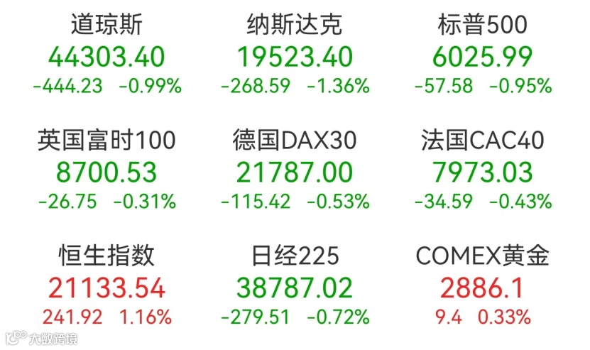 特朗普的上述声明震撼了金融市场,CNN指出,特朗普周五宣布的新潜在关税可能波及全球各个角落,这让投资者感到不安。道指下跌超400点,跌幅达0.99%,标普500指数也下跌0.95%,以科技股为主的纳斯达克综合指数下跌1.36%。大型科技股多数下跌,亚马逊跌超4%,创去年12月18日以来最大单日跌幅;特斯拉、谷歌跌超3%,苹果跌超2%,微软、英特尔跌超1%,奈飞小幅下跌;英伟达、Meta小幅上涨。其中,特斯拉本周累跌近11%,创去年10月以来最大跌幅。