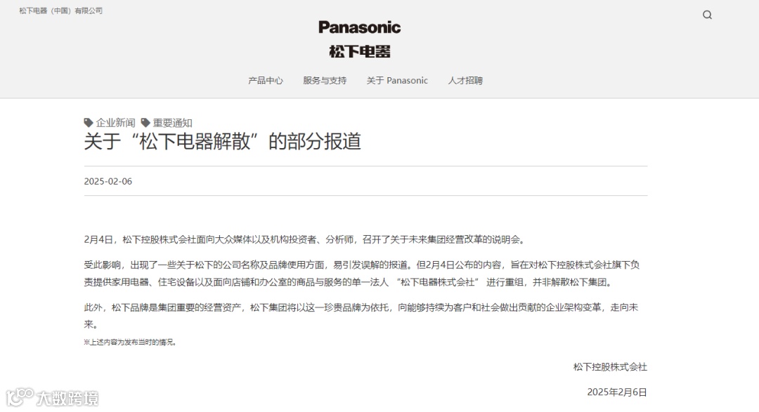 据松下电器官网2月6日消息,松下控股株式会社发布声明称,2月4日,松下控股株式会社面向大众媒体以及机构投资者、分析师,召开了关于未来集团经营改革的说明会。受此影响,出现了一些关于松下的公司名称及品牌使用方面,易引发误解的报道。但2月4日公布的内容,旨在对松下控股株式会社旗下负责提供家用电器、住宅设备以及面向店铺和办公室的商品与服务的单一法人 “松下电器株式会社” 进行重组,并非解散松下集团。