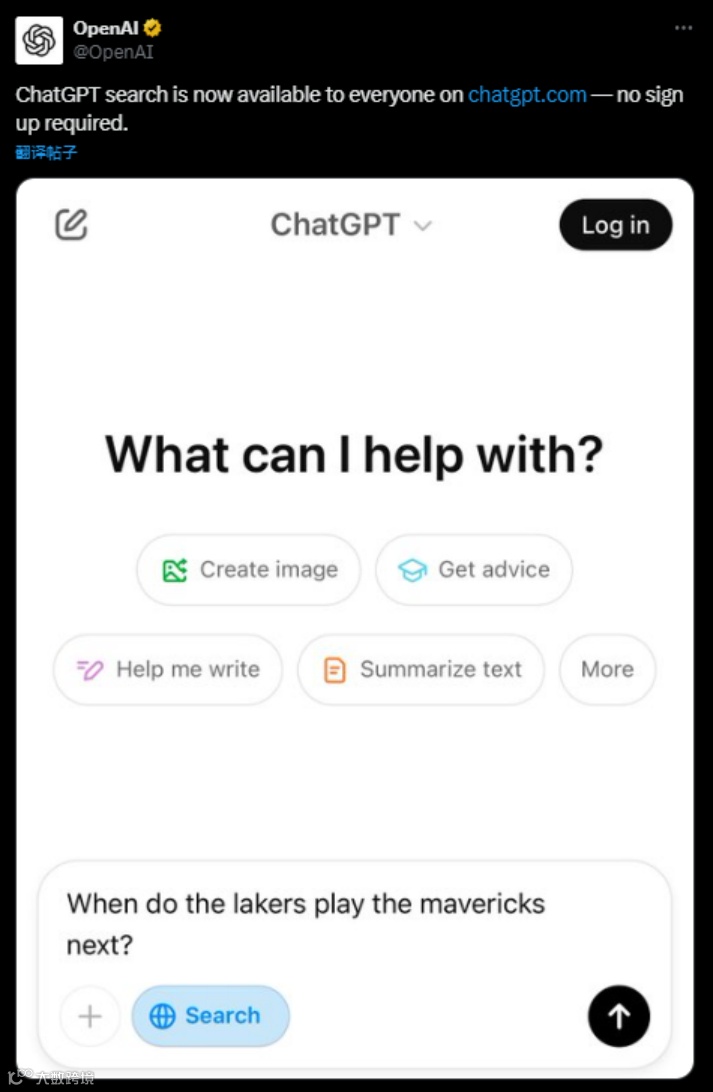 OpenAI最初于去年10月向付费用户提供了搜索引擎功能,并于同年12月向所有用户开放。如今,用户无需账户即可使用该功能。