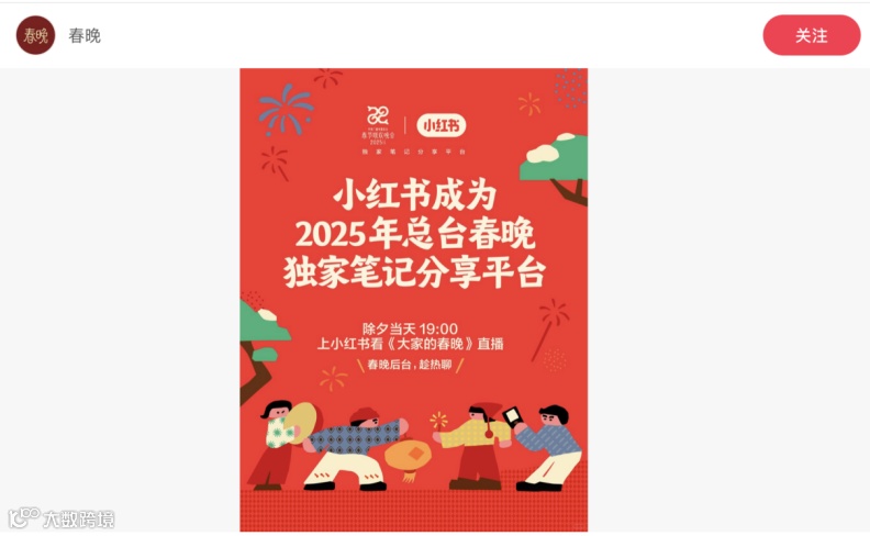 1月13日,小红书平台官宣,在新春期间与央视春晚携手,成为《2025年春节联欢晚会》的独家笔记分享平台。