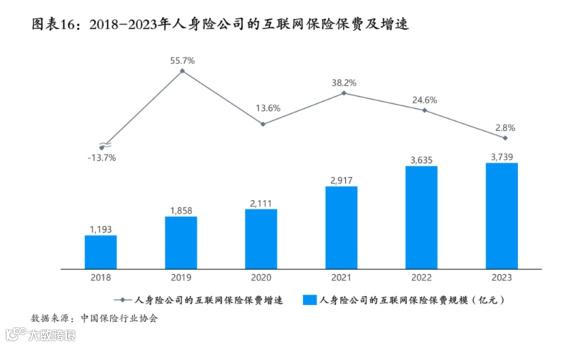 人身险公司的互联网保险(简称“互联网人身险”)自2019年以来增速呈现波动下降的趋势,2023年互联网人身险保费达到3739亿元,同比增长2.8%。