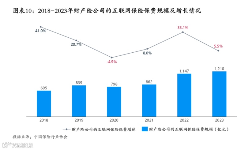 2023年,财产险公司的互联网保险(简称“互联网财产险”)保费规模达到1210亿元,同比增速5.5%,相较上一年的33%增速出现较大幅度下降。据悉,自2018年以来,互联网财产险保费的增速波动较大,但整体保费规模呈现上升的趋势。