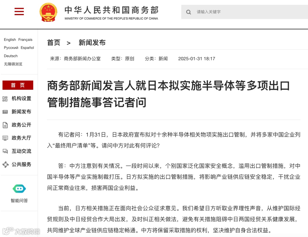 商务部新闻发言人就日本拟实施半导体等多项出口管制措施事答记者问