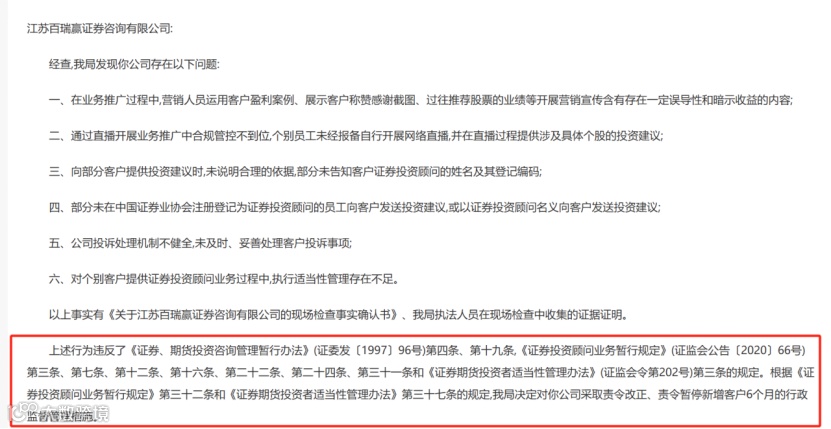 江苏证监局表示,以上事实有《关于江苏百瑞赢证券咨询有限公司的现场检查事实确认书》、该局执法人员在现场检查中收集的证据证明。上述行为违反了《证券、期货投资咨询管理暂行办法》等相关规定,决定对江苏百瑞赢采取责令改正、责令暂停新增客户6个月的行政监督管理措施。