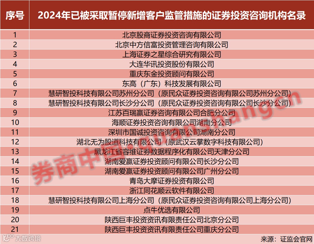 据不完全统计,2024年内,共有30家证券投资咨询机构(不包括分支机构)收到监管下发的35张“罚单”,被采取了监管谈话、责令改正、增加内部合规检查次数并提交合规检查报告、暂停新增客户以及罚款等行政监管措施和行政处罚措施。其中,合计有21家证券投资咨询机构或证券投资咨询机构分公司被暂停新增客户。
