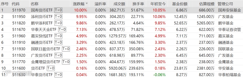 截至收盘,国寿货币ETF涨停,广发添利货币ETF、鹏华添利ETF分别上涨9.95%、9.86%,此外还有华泰天天金ETF、嘉实快线ETF的涨幅分别达到7.13%、4.99%。
