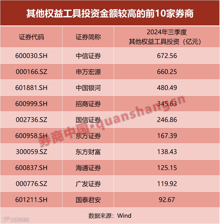 券商的财务报表一定程度上也反映了券商在红利资产方面增加了配置。证券时报记者以券商2024年三季报的口径统计,不少头部券商半年报中其他权益工具期末金额大幅增加。