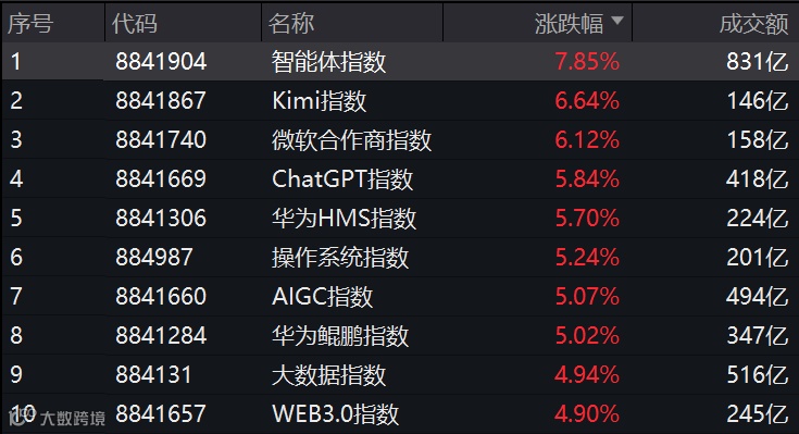 周五,A股三大指数集体收涨,AI概念股纷纷大涨,活跃了市场人气。截至收盘时,Wind智能体指数大涨近8%,Kimi指数涨近7%,ChatGPT指数涨超6%,AIGC指数涨超5%。整个AI方向,涨停或涨超10%的个股超过30只,其中包括开普云、世纪天鸿、初灵信息、神思电子、汉王科技、盛通股份、启明星辰、焦点科技、瀛通通讯等。