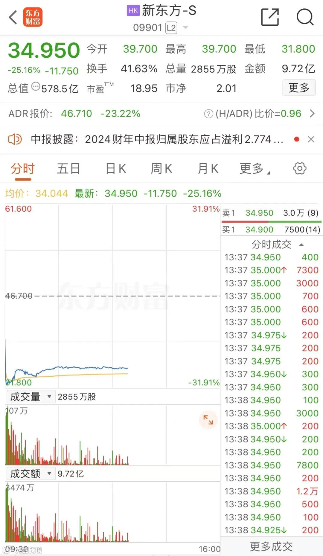 今日港股开盘后,新东方股价突然闪崩,盘中一度暴跌超30%。消息面上,新东方最新公布的2025财年上半年财报显示,第二财季Non-GAAP净利润按年下跌29.1%至3554.1万美元;Non-GAAP经营利润2758万美元,同比大幅下降45.8%;调整后每ADS收益为0.22美元,不及市场预期。