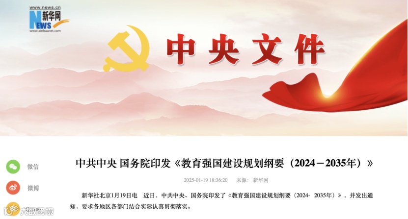 1月19日,新华社消息,近日,中共中央、国务院印发了《教育强国建设规划纲要(2024—2035年)》(以下简称“纲要”),面向到2035年建成教育强国目标,对加快建设教育强国作出全面系统部署。纲要是首个以教育强国为主题、以全面服务中国式现代化建设为重要任务的国家行动计划,是全面推进教育科技人才一体统筹发展、提升国家创新体系整体效能的顶层制度安排。
