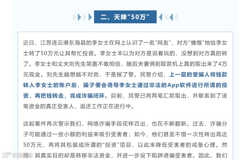 以天降“50万”案例为例,诺安基金《文章》显示,江苏连云港东海县的李女士在网上认识了一名“网友”,对方“慷慨”地给李女士转了50万元让其帮忙投资。李女士本以为对方是说着玩的,没想到对方真的转了。李女士和丈夫刘先生简直不敢相信,随后夫妻俩到取款机上真的取出来了4万元现金。刘先生越想越不对劲,于是报了警。民警介绍,上一层的受骗人将钱款转入李女士的账户后,骗子便会诱导李女士通过非法的App软件进行所谓的投资,再把钱转走,完成诈骗闭环。