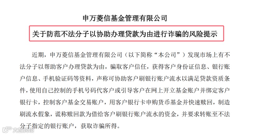 一是以协助办理贷款为由进行诈骗。申万菱信基金1月18日公告显示,不法分子以帮助客户办理贷款为由,骗取客户信任,获得客户身份证信息、银行账户信息、手机验证码等资料,声称可协助客户刷银行账户流水以满足贷款资质条件,使用自己控制的手机号码代客户或引导客户在网上开立基金账户并绑定客户银行卡,控制客户基金交易账户,用客户银行卡申购货币基金并快速赎回,制造刷流水假象,谎称赎回款为借给客户刷银行账户流水的资金,并要求转账至不法分子指定的银行账户,获取诈骗所得。