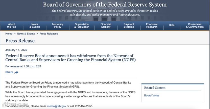 美东时间1月17日,美联储意外宣布,退出央行与监管机构绿色金融网络(NGFS)。