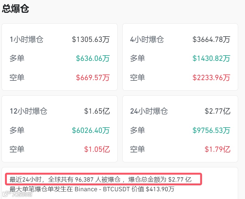 价格的剧烈波动导致币圈再次发生大规模爆仓事件。Coinglass数据显示,过去24小时内,加密货币市场全网爆仓人数达到9.6万人,爆仓总金额为2.77亿美元。