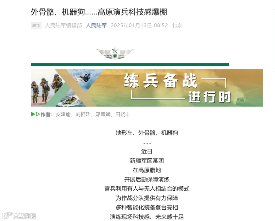 就在今天早上,人民陆军官微重磅发布题为《外骨骼、机器狗……高原演兵科技感爆棚》的文章提及,近日新疆军区某团在高原腹地开展后勤保障演练官兵利用有人与无人相结合的模式为作战分队提供有力保障多种智能化装备登台亮相演练现场科技感、未来感十足。