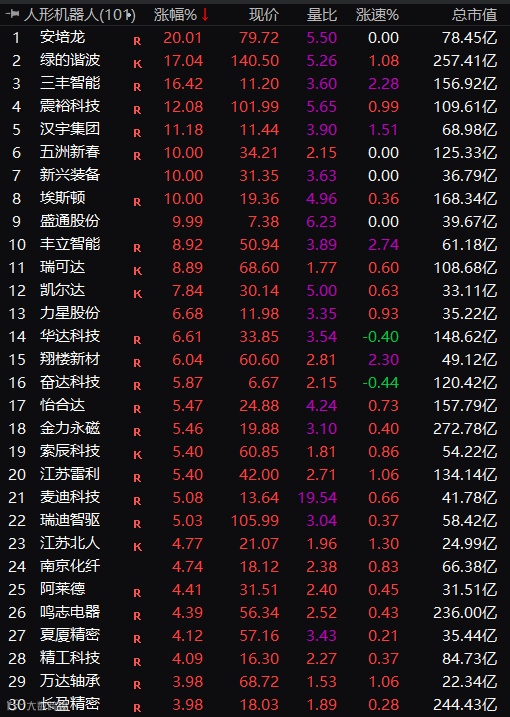 从股市来看,今天早盘,人形机器人板块全线发力,截至10:50,板块涨幅超过3%,位居两市板块涨幅榜首;板块内个股更是全线上涨,安培龙拿下20%涨停,绿地谐波、三丰智能、震裕科技、汉宇集团、五洲新春、新兴装备、埃斯顿、盛通股份等涨停或涨超10%,丰立智能、瑞可达涨超8%,凯达尔涨超7%,力星股份、华达科技、翔楼新材涨超6%。