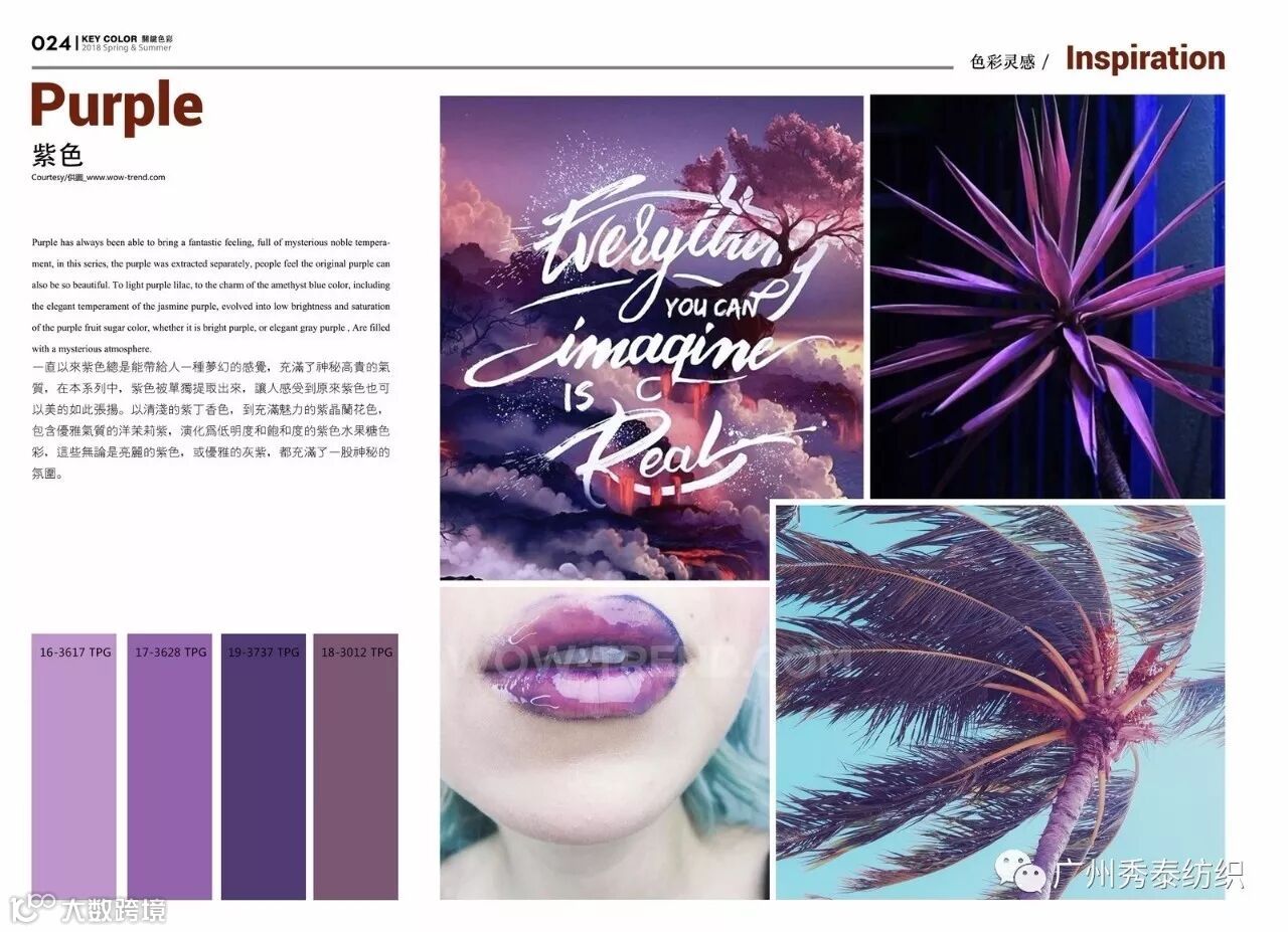 优雅的紫色加入了玫红紫色和紫红色而变的更加妩媚动人,磨砂紫色一如少女的浪漫甜美,矮牵牛紫在不同面料上体现不同的气质。