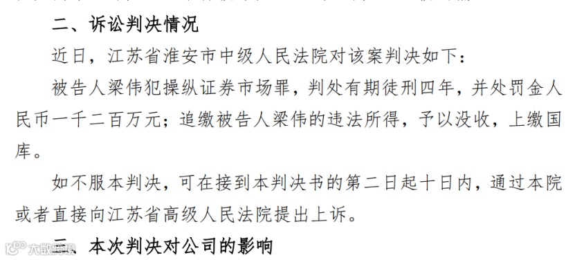 公告中表示,梁伟未担任公司董事、监事、高级管理人员,上述判决为股东个人行为,不会对公司本期利润或期后利润产生影响。