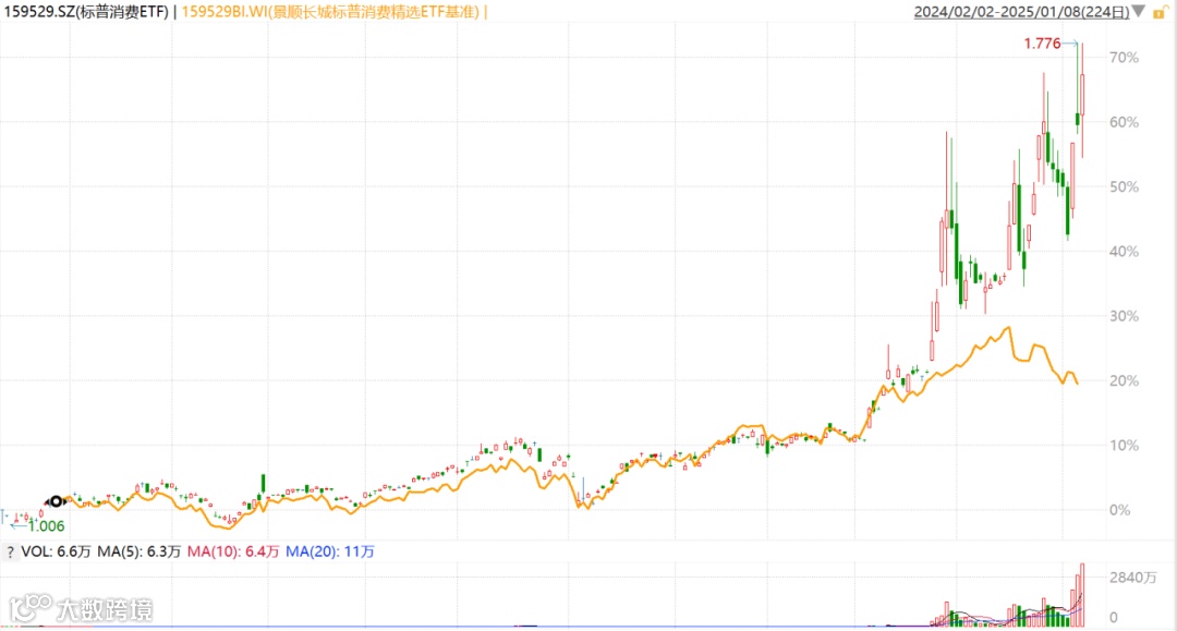 拉长时间来看,自去年12月初以来,标普消费ETF的场内价格便已经与业绩比较基准标普500消费精选指数发生明显背离。1月7日,标普消费ETF的溢价率也一度达到38%以上,收盘溢价回落至30.05%;1月6日,标普消费ETF的市场表现更是“一枝独秀”,在开盘后不久,该ETF便因此前高溢价开市后暂停交易一小时,复盘后继续走强,在尾盘强势冲击涨停,单日以涨幅10%收官。