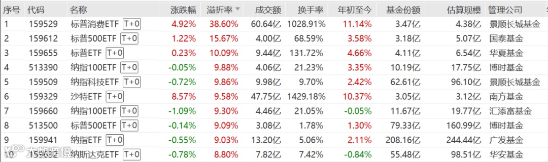 除了标普消费ETF外,Wind数据显示,截至1月8日收盘,标普500ETF、标普ETF的溢价率也分别达到了15.67%、10.09%,全市场有26只跨境ETF溢价超过5%。