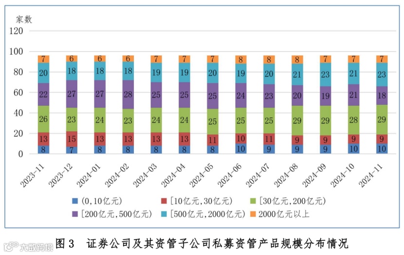 截至2024年11月底,券商私募资管产品规模平均值为570.19亿元,中位数为201.60亿元。需要注意的是,资管新规之后,这组数据近年来持续保持下降趋势。