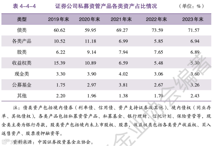 年报2024中提到,证券公司私募资管计划主要配置债类资产,近年债类资产配置比例连续提升,截至2023年末,债类资产占比达71.57%;股类资产与收益权类资产配置比例均有所下降,截至2023年末分别占6.89%、5.30%。