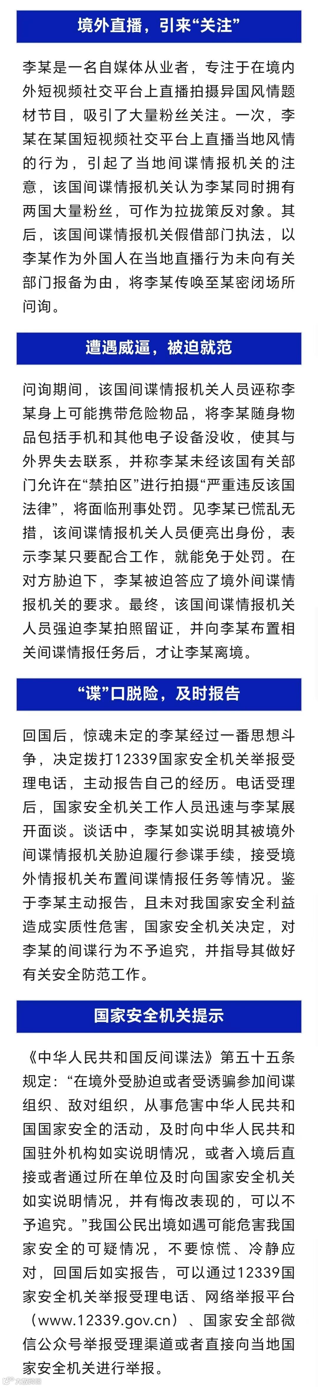 “国家安全部”微信公众号26日发布消息:近年来,我出国(境)人员在境外屡遭间谍情报机关攀拉策反,对我国家安全和公民人身安全构成风险隐患。面对境外间谍情报机关主动贴靠、滋扰盘查、威逼利诱,广大公民应及时向国家安全机关举报,维护国家安全和个人权益。