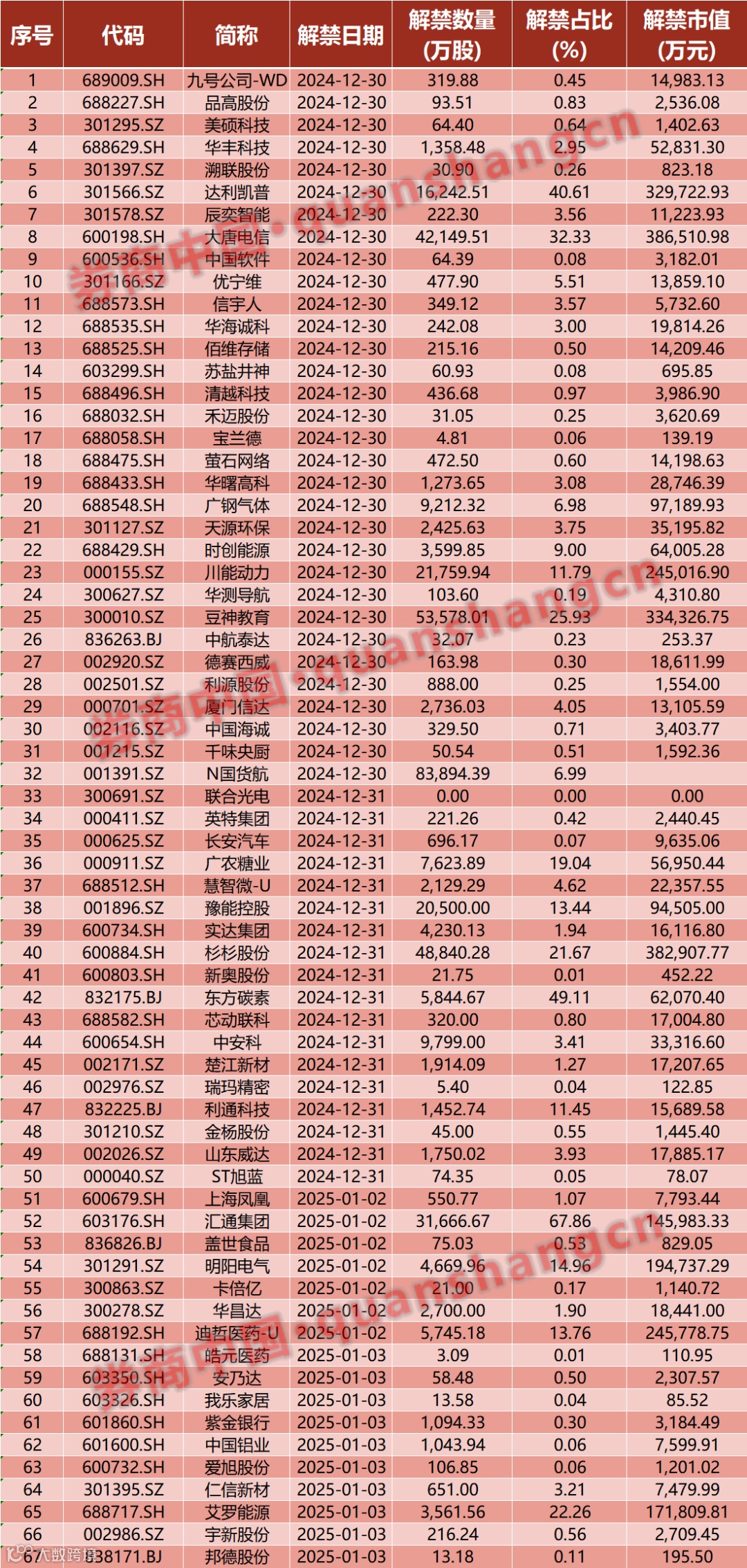 本周(12月30日到1月3日)A股市场将有67只股票面临限售股解禁,合计解禁数量为40.05亿股,按最新收盘价计算,合计解禁市值为328.84亿元。从解禁股情况来看,大唐电信、杉杉股份、豆神教育、达利凯普解禁市值将均超30亿元。