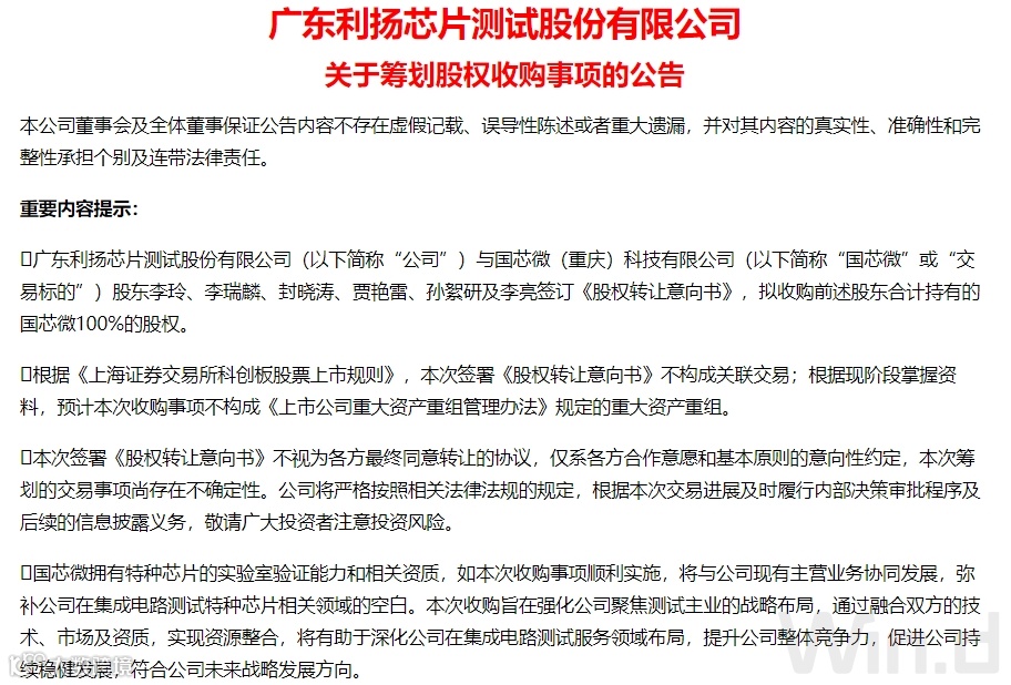 12月30日晚间,利扬芯片(688135)发布一纸关于筹划股权收购事项的公告,公司与国芯微(重庆)科技有限公司(简称“国芯微”)股东李玲等签订股权转让意向书,拟收购前述股东合计持有的国芯微100%的股权。国芯微拥有特种芯片的实验室验证能力和相关资质,如本次收购事项顺利实施,将与公司现有主营业务协同发展,弥补公司在集成电路测试特种芯片相关领域的空白。