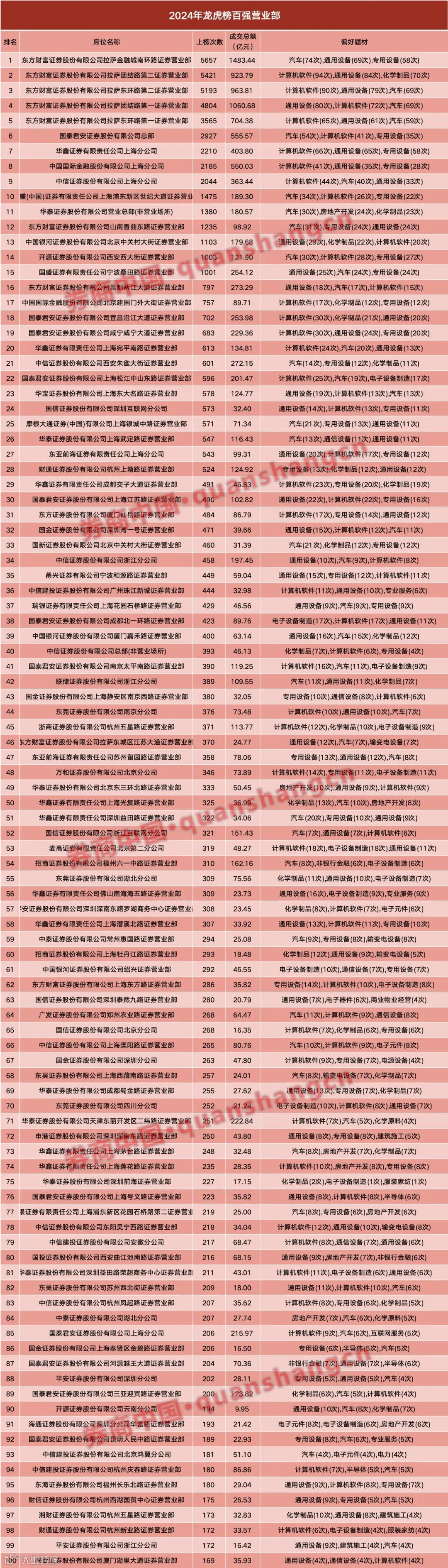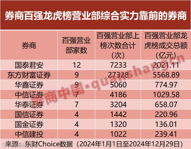 例如,高盛(中国)证券上海浦东新区世纪大道证券营业部在2024年凭借1475次上榜次数、189.30亿元的成交额排名第十。