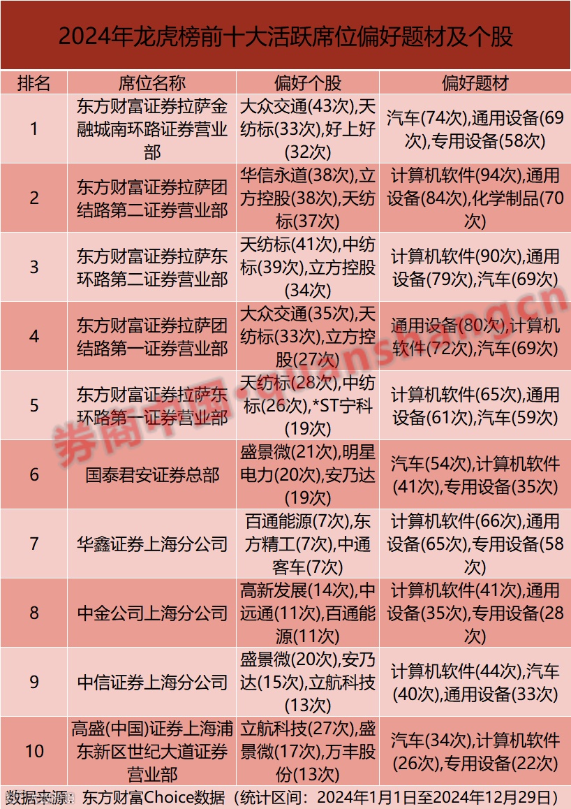 东方财富Choice数据显示,2024年,不同券商营业部席位偏好的题材与个股风格迥异。