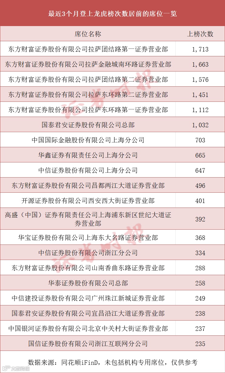 据同花顺iFinD数据,最近3个月来,有近5000家龙虎榜席位登上龙虎榜,上榜龙虎榜次数居前二十的席位中,除了机构席位外,东方财富证券旗下的多家营业部席位上榜次数居前,其中,东方财富证券拉萨团结路第一证券营业部以超过1700次的上榜次数位列龙虎榜席位首位;东方财富证券旗下的拉萨金融城南环路证券营业部、拉萨团结路第二证券营业部、拉萨东环路第二证券营业部、拉萨东环路第一证券营业部上榜次数亦均超过千次。