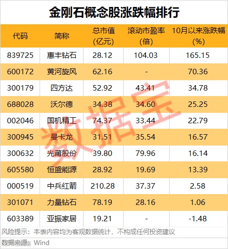 行情方面,10月以来,惠丰钻石曾出现大幅上涨,区间最高涨幅一度超4倍,最新涨幅仍超165%。黄河旋风曾一度连续收获5个涨停板,10月至今累计涨幅超70%。四方达、沃尔德、国机精工等10月至今涨幅超20%。