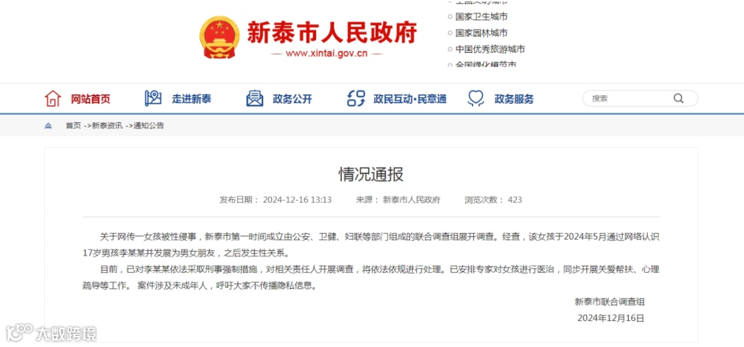 12月16日,山东省新泰市联合调查组通过新泰市人民政府网站通报“网传一女孩被性侵事件”。