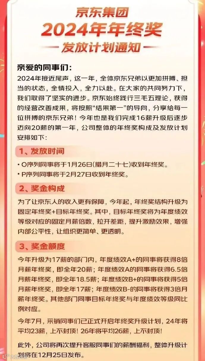 两天前,京东集团公布2024年年终奖发放计划通知:绩效最高的员工可以获得8倍月薪的年终奖,即全年20薪。