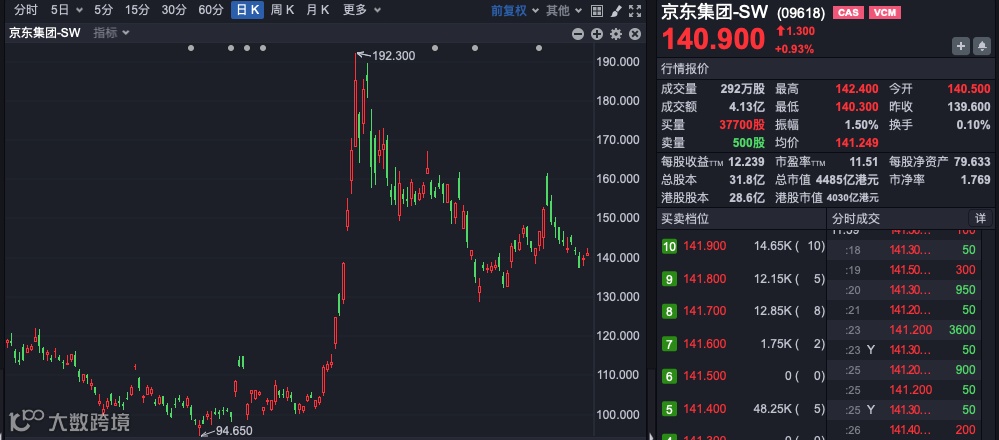 目前,京东集团最新股价为140.9港元/股,最新市值为4485亿港元。