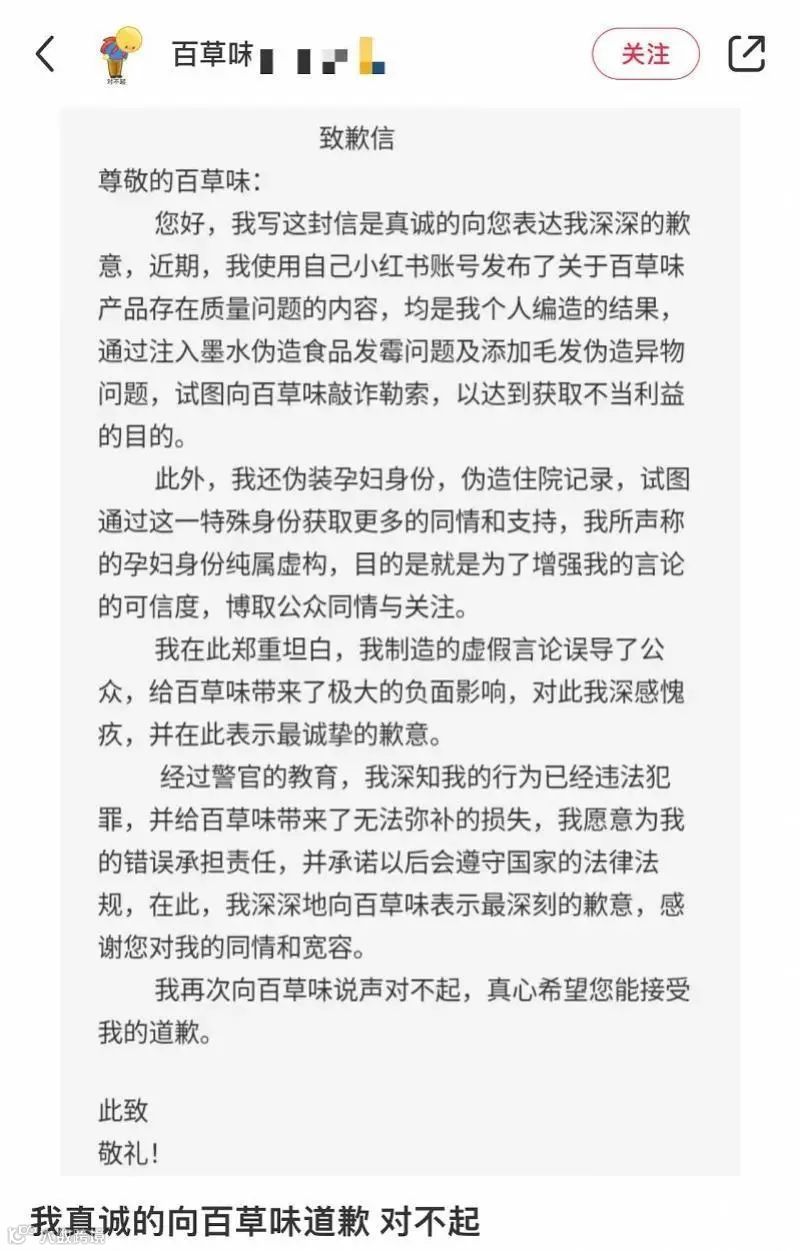 其孕妇身份纯属虚构,目的是增强其言论的可信度,博取公众的同情和关注。该网友向百草味道歉,并表示愿意承担责任。
