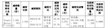 减持完成后,People Better持有公司存托凭证减少至3584.07万份,占公司存托凭证总数比例将由此前6.03%减少至4.998%。