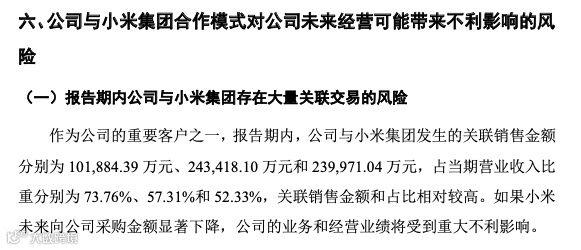九号公司主要从事电动平衡车、电动两轮车等。也是小米生态链的重要一员。期初招股书显示,作为公司的重要客户之一,2017年—2019年,九号公司与小米集团发生的关联销售金额分别为10.19亿元、24.34亿元和23.99亿元,占当期营业收入比重分别为73.76%、57.31%和52.33%。
