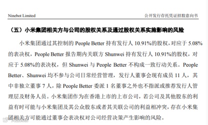 People Better是谁?九号公司IPO招股书显示,小米集团通过其控制的People Better持有发行人10.91%的股权,对应于5.08%的表决权,People Better关联方Shunwei持有发行人10.91%的股权,对应于5.08%的表决权,但Shunwei与People Better不构成一致行动关系。