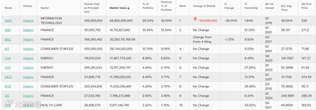 此外,排名第六至第十的其他重仓股分别为:西方石油、穆迪、卡夫亨氏、安达保险以及德维特,持仓数量均保持不变。
