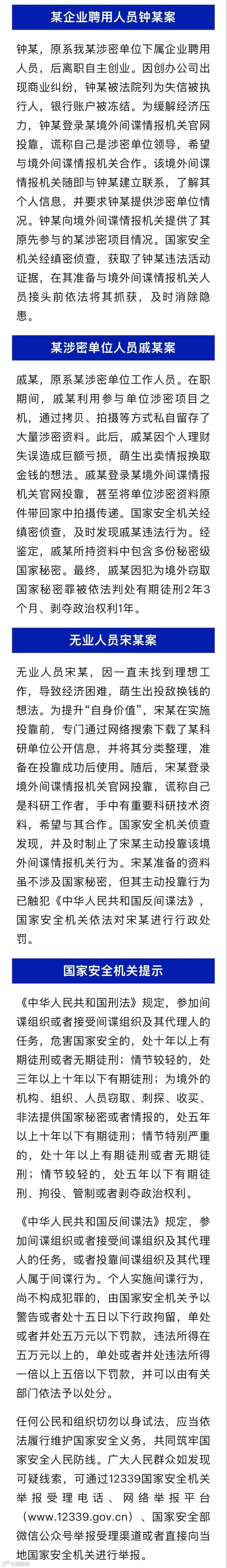 据国家安全部微信公众号16日消息,近期,国家安全机关陆续破获多起涉案人员主动投靠境外间谍情报机关危害国家安全案件,及时消除泄密隐患,给予不法分子有力震慑。