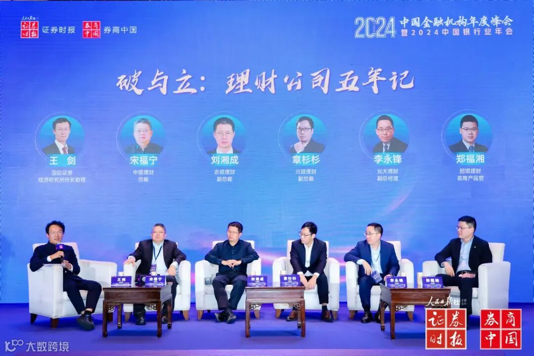 近日,由证券时报社主办的“2024中国金融机构年度峰会暨2024中国银行业年会”在深圳举行。在名为《破与立:理财公司五年记》的圆桌对话环节,中银理财总裁宋福宁、农银理财党委委员刘湘成、兴银理财副总裁章杉杉、光大理财副总经理李永锋、招银理财首席产品官郑福湘,共同复盘银行理财一次转型五年路的展业经验,并探讨在二次转型中如何凸显韧性。