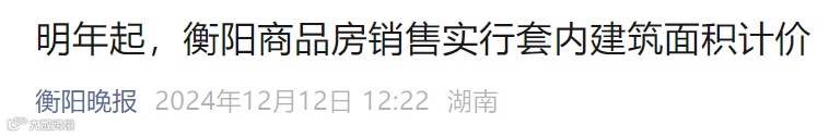 12月12日,据“衡阳日报”视频号报道,自2025年1月1日起,衡阳市商品房销售实行套内建筑面积计价。