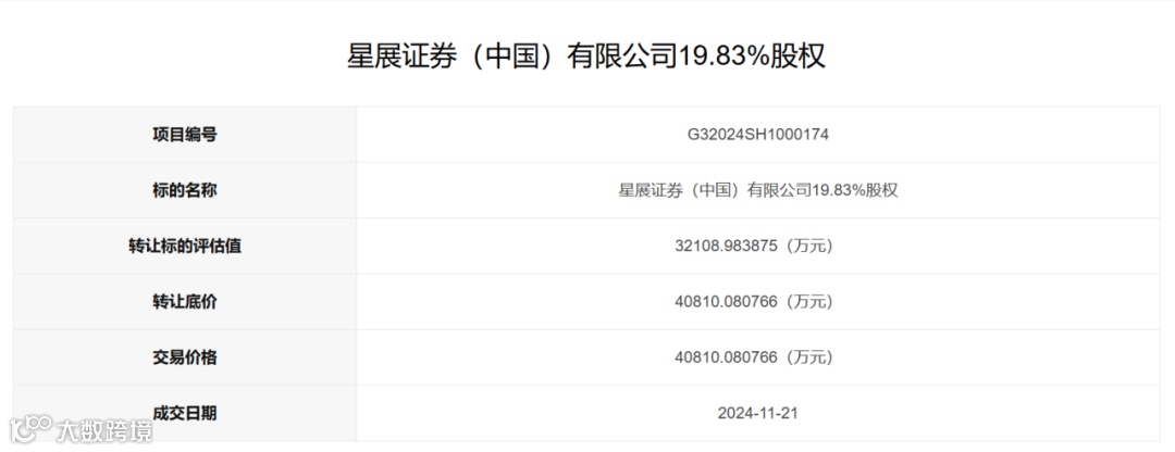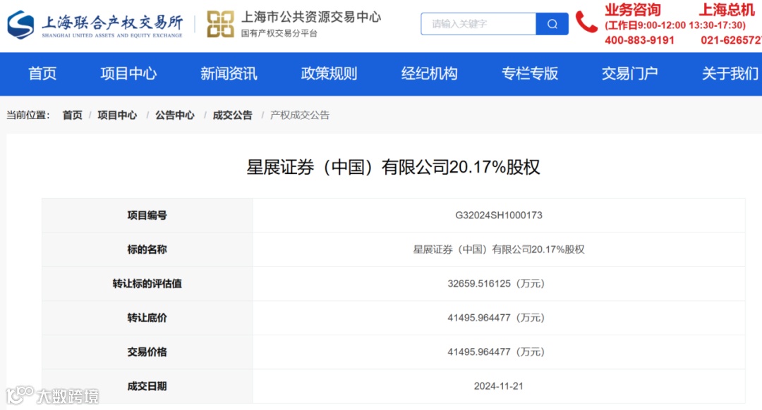 上海联合产权交易所网站信息显示,星展证券两笔股权转让项目已于11月21日成交,转让比例合计为40%,交易价格合计8.23亿元。